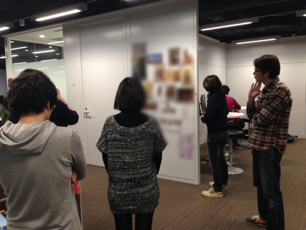 毎日行われる、所属チームの進捗ミーティングに参加します。このミーティングでは、壁に制作物を貼ってそれぞれの進捗を報告するので、ひと目で今やっている内容がわかるようになっています。今日の私はミーティングが多かったので、あんまり作業が進んでないように見えます…。
