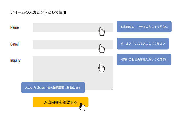 フォーム内容の説明を表示させ使い勝手を向上させる例。入力中のフォームの傍に入力を手助けするヒントを表示。 |