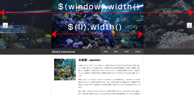 まずヘッダーエリアの上にスライドショーを設置しますが、レイアウトによってはヘッダーの下など場所は自由に設定することができます。画像はli要素を使用して配置し、左右への移動ボタンをその下に配置させて、ボタンでのスライドの移動と一定時間でアニメーションさせる機能を追加させます。今回スライドさせる画像の幅と高さについてはモバイル対応させることを想定し、サイズの記述はしません。