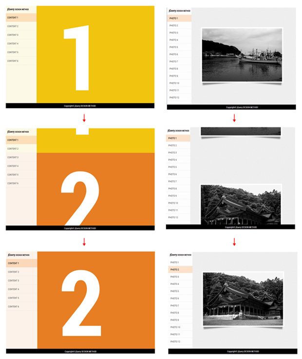 上記で紹介したサンプルの他に書籍の方ではナビゲーションを追加したパターンやコンテンツの写真を追加し、フェードで出現するパターンなども作成しております。
