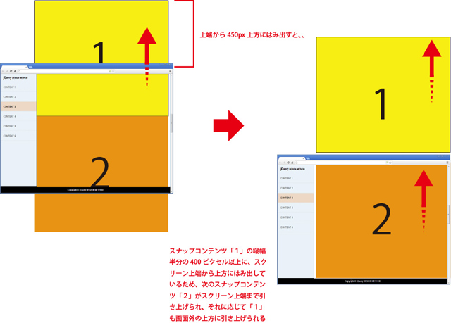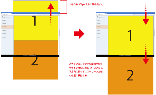逆方向も同様で、スクリーンを上方にスクロールアップすると、要素はすべて下方向に流れて行くため、スナップコンテンツの縦幅半分以上がスクリーン上端よりも下に移動していれば、さらに上方にスクロールアップされ、前のスナップコンテンツの始まりの位置まで移動されます。