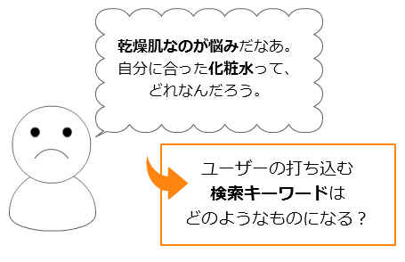一方、あるユーザーが「乾燥肌で悩んでいるから、乾燥肌にやさしい化粧水がほしい」と思ったとします。当然このユーザーもターゲットですから、入力しそうな検索キーワードを想定してWebサイト内に用意していく必要があります。では、このユーザーはどのような検索キーワードを入力するでしょうか?