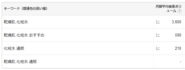 このデータを見ると、「乾燥肌 化粧水」というキーワードが月間でおおむね3600回検索されていることがわかります。私の経験則からしても比較的多い数字であるという印象です。