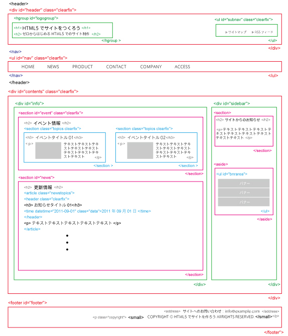現段階ではHTML5の仕様は確定していないので、これから無くなる可能性もあるのでセレクタに新要素はあてずにclass、idをつけるのが無難すので今回のサンプルもそのようにしました。