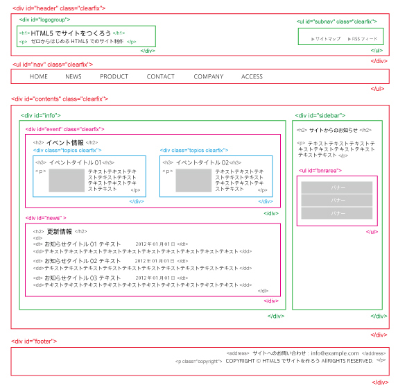 HTML5の新要素のheader要素は下のグローバルナビゲーションを含めてheaderとしたかったので、floatをclearさせるためにid="header" class="clearfix"を使いましたので、HTML5ではheader要素の中にdiv要素を入れました。
