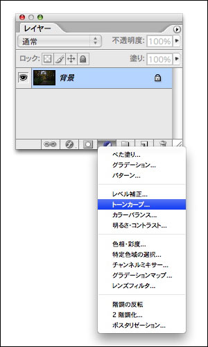 調整レイヤーはボタンまたはメニューから簡単に追加することができる。ここではトーンカーブの調整レイヤーを作成して基本操作を覚えよう。