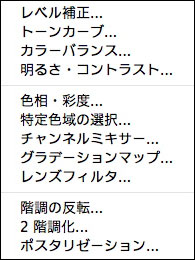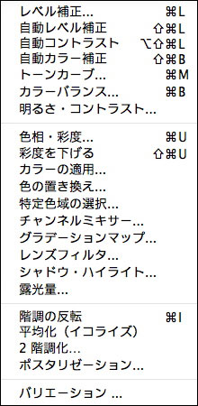 色調補正の項目の中には、調整レイヤーを利用できないものがある。下の図は左がイメージメニューから選択できる色調補正の項目、右が調整レイヤーで選択できる項目だ。調整レイヤーが使えない補正項目については、元画像のレイヤーを複製して作業するとよい。