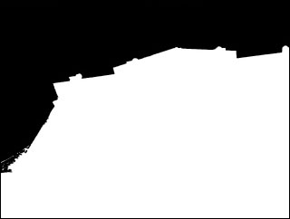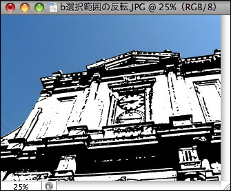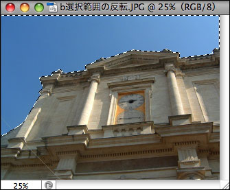 選択範囲が指定されている状態で選択範囲の反転を実行すると、逆に選択されていなかった部分が選択範囲となる。これを利用すれば、選択が難しい被写体も簡単に選択できる場合がある。たとえば、白いバックに立つ人物を切り抜きたいとき、自動選択ツールで白い部分を選択し、反転すれば人物だけを選択できる。ここでは、風景写真の建物だけを選択してみよう。