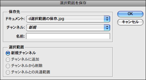 1.選択範囲メニュー→“選択範囲を保存...”でダイアログを表示し、保存先の書類と名前を設定する。[チャンネル]では新規に保存するか、既存の選択範囲に追加または削除して読み込めるかを選択できる。