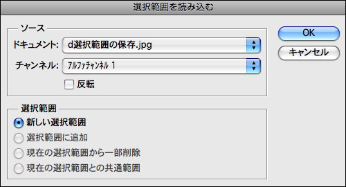 3.選択範囲の読み込むには、選択範囲メニュー→“選択範囲を読み込み...”でダイアログを表示し、[ソース]を設定して読み込みたい選択範囲を指定する。[ドキュメント]ではほかの書類で保存した選択ファイルを読み込むことも可能だ。
