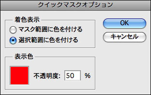 選択範囲の表示色や着色表示のルールは、ツールボックスの[クイックマスクモードで編集]をダブルクリックすると表示されるクイックマスクオプションでカスタマイズできる。編集する画像の内容に合わせ、作業しやすいようにあらかじめ調節しておくとよいだろう。