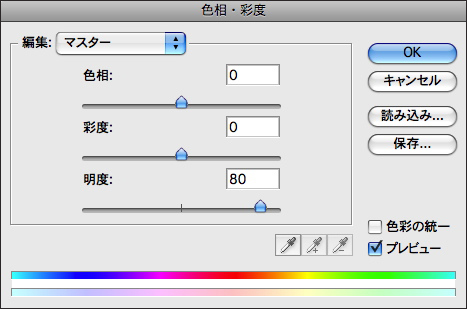 2.[色相・彩度]ダイアログで[明度:80]に設定して画像全体を明るくする。