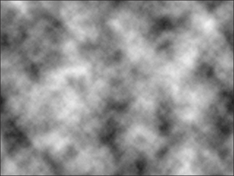 3.レイヤーパレットに戻り、optionキーを押しながら追加された調整レイヤーのレイヤーマスクサムネールアイコンをクリック。レイヤーマスクが画像として表示される。この状態で“描画”→“雲模様1”フィルタを実行すると、レイヤーマスクが図のように描画される。再度optionキーを押しながらレイヤーマスクサムネールアイコンをクリックして通常表示に戻すと、全体に画像全体にリアルなもやが作成される。