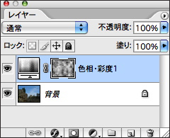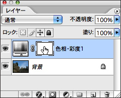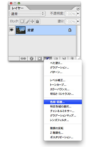 1.まずは画像を開き、レイヤーパレット下部にある[塗りつぶしまたは調整レイヤーを新規作成]ボタンをクリックして、メニューから[色相・彩度]を選択する。