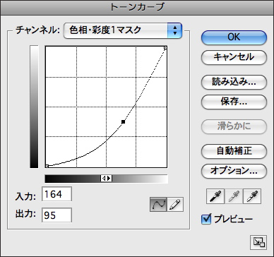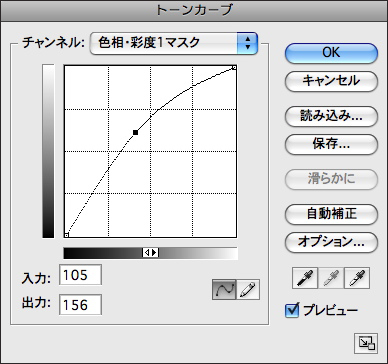 4.もやの濃淡はトーンカーブを使ってレイヤーマスクを調整すればよい。調整レイヤーが選択されている状態でイメージメニュー→“色調補正”→“トーンカーブを実行し、カーブを山形にして明るくすると全体のもやが増える。谷型にするともやが少量になる。すべてよければ加工完了だ。