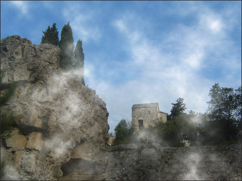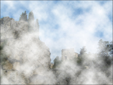 風景写真の全体にもやを作成する。調整レイヤーを追加して全体を明るくし、その調整レイヤーのレイヤーマスクに雲模様フィルタを適用する。すると調整レイヤーが雲模様でマスクされ、もやのような濃淡が発生する。もやの量はトーンカーブを使って、レイヤーマスクの明るさを調整することで微細にコントロールできる。このテクニックは、料理の湯気や立ちこめる砂塵などの作成にも利用できるだろう。