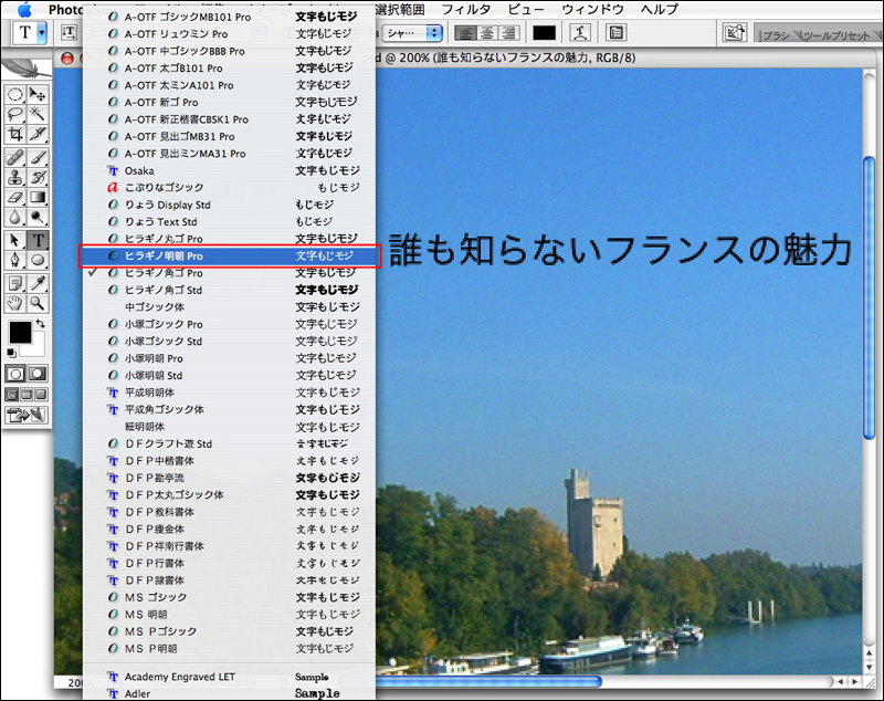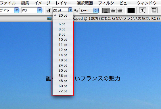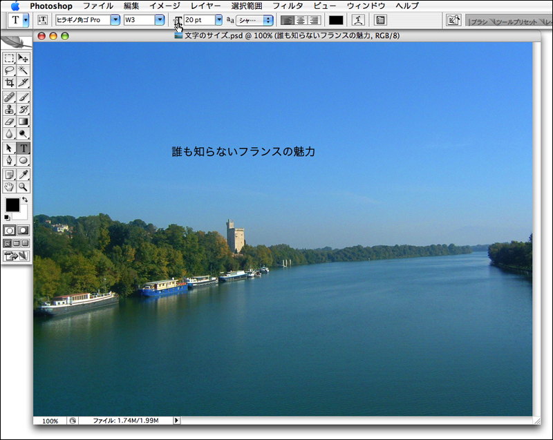 Photoshop CS2の文字のサイズの単位は3種類から選択できる。作業のしやすい単位に設定しよう。設定方法は“Photoshop”メニュー→“環境設定”→“単位・定規”を選択し、[環境設定]ダイアログボックスの[単位]の[文字]の項目を[pixel][point][mm]から選択する。