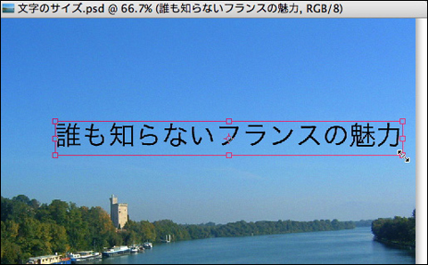 4つ目は、“編集”メニュー→“変形”→“拡大・縮小”を選択し、バウンディングボックスをドラッグする方法だ。そのままドラッグすると、文字は任意の縦横比率に変形される。shiftキーを押しながらドラッグすると文字の縦横比率は保たれる。