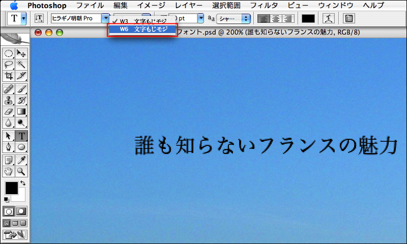 書体のことをフォントといい、フォントにはバリエーションが用意されているものが多い。文字の線の太さを「ウエイト」と呼び、[W3]や[Bold]のように表記される。ただし、フォントによってはバリエーションがないものもある。