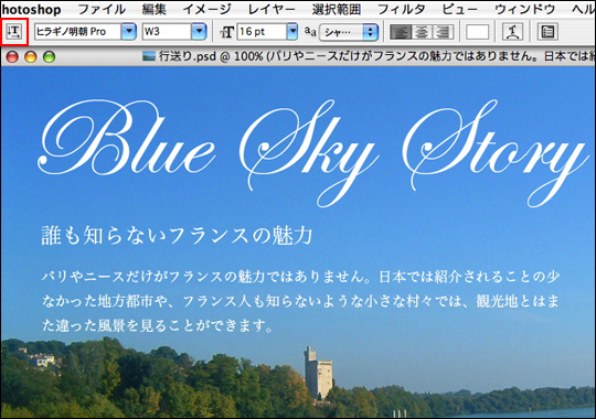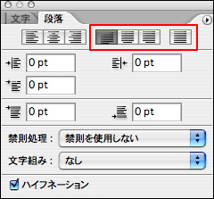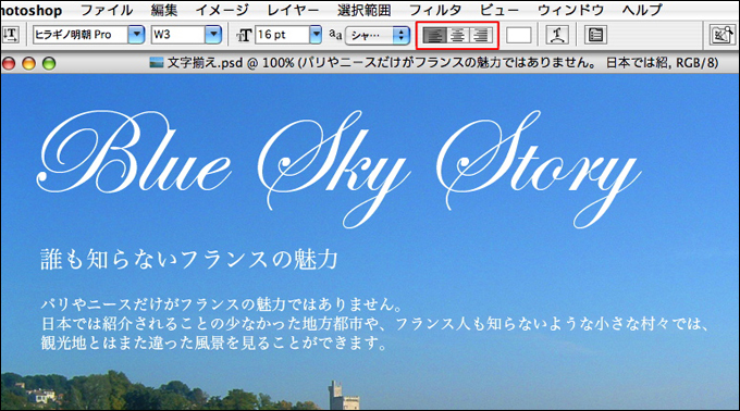 エリア内に文字を入力した場合は、文字が自動的にエリアのサイズによって改行される(詳しくは「テクニック6:文字の基本-(6)エリア内テキスト」を参照)。エリア内テキストで入力した文字はオプションバーの3つの行揃え以外の揃え方ができる。ウィンドウ メニュー→“段落”を選択して段落パレットを表示すると[均等配置(採集行左揃え)]など、さらに4つの行揃えが選択できる。