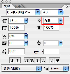 [トラッキング]、[カーニング]は文字の間隔を調整するための設定で、[トラッキング]は複数の文字の間隔を一括で行い、[カーニング]は1文字ずつの間隔を設定する。いずれも数値の単位は[em]で、1文字の幅を1000/1000emとして、どれだけの比率で文字間を調節するのかを設定する。[トラッキング]はレイヤーパレットでテキストレイヤーを選択して数値を入力して設定し、[カーニング]は文字間を調節したい場所にIビームポインタを挿入してから設定を行う。
