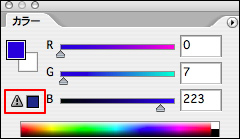 RGBカラーで設定した色が、CMYKカラーに変換したときやプリント時に、正確に表示やプリントできない場合、色域外警告が表示され、その色に最も近い色の候補が表示される。この色の部分や警告アイコンをクリックすると最も近い色に変換される。