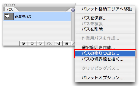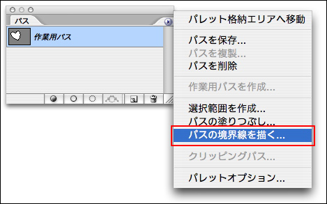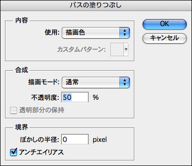 パスは選択範囲を作成するほかに、塗りつぶしたり、パスの境界線を描画ツールで描いたりすることができる。塗りつぶすには、まずパスを作成しパスパレットのメニューから[パスの塗りつぶし]を選択し、表示されるダイアログボックスで各種設定を行って[OK]ボタンをクリックすると、パスの内部が塗りつぶされる。境界線を描くには、パスを作成したら、描画ツールを選択してブラシサイズや描画色などの各種設定を行っておく。続いてパスパレットのメニューから[パスの境界線を描く]を選択し、表示されるダイアログボックスでツールを選択して[OK]ボタンをクリックすると、パスの境界線を描くことができる。