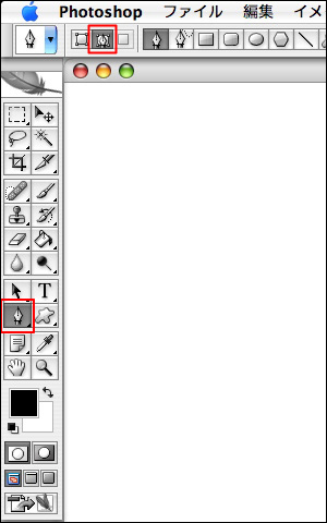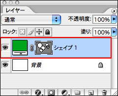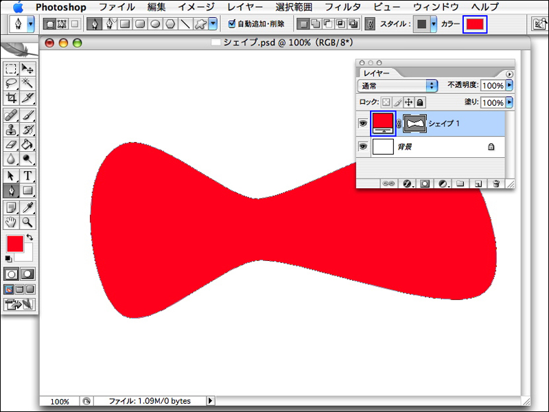 シェイプの描き方は、まず描画色を設定して、ツールボックスからペンツールを選択し、オプションバーの[シェイプレイヤー]ボタンをクリックして、画像ウィンドウ内をパスと同様の操作で描いていく。シェイプはパス選択ツールやアンカーポイントの追加ツールなどを使って編集することが可能だ。シェイプの色を変更するには、ペンツールを選んでいる状態でオプションバーの[カラー]の色のついたボックスをクリックするか、レイヤーパレットのシェイプレイヤーのレイヤーサムネール部分をダブルクリックして[カラーピッカー]を表示させて、色を設定する。