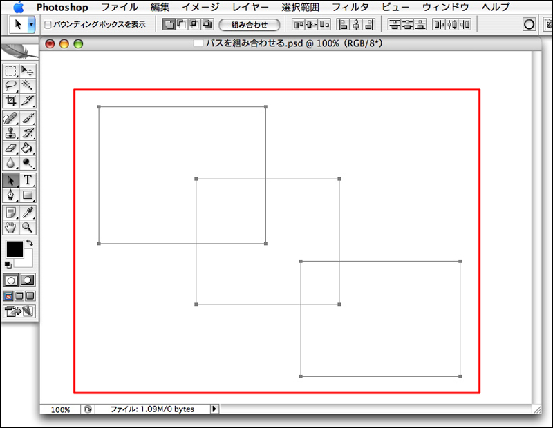 複数のパスを描いて組み合わせることができる。まず、パスを複数描いて、パスコンポーネントツールで組み合わせたいパスを選択する。オプションバーの[組み合わせ]ボタンの左側にある4つのボタンから、パスの組み合わせ方を選択し[組み合わせ]ボタンをクリックする。