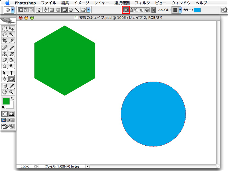 複数のシェイプを描くときはオプションバーの設定に注意しよう。通常シェイプを描く場合は、オプションバー中央の[新規シェイプレイヤーを作成]が選択されている。