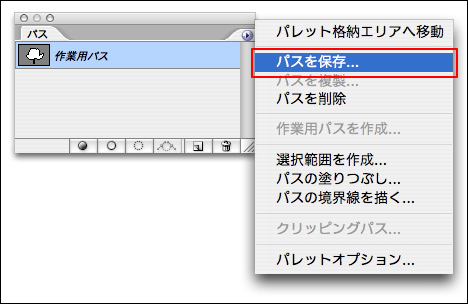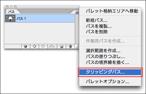 「クリッピングパス」は、InDesignなどのDTPのアプリケーションに画像を切り抜いてレイアウトするときに利用する機能だ。画像の切り抜きたい形にパスを描き、[パス]パレットメニューから[パスを保存]を選択して、表示されるダイアログボックスで名前を付けて[OK]ボタンをクリックする。