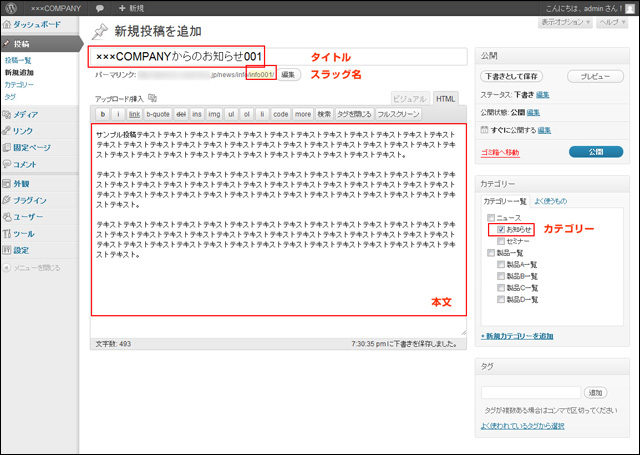 まず「お知らせ」のカテゴリーとしてサンプル記事を投稿して、TOPページに表示させます。今回のサンプルサイトでのカテゴリーをどのように設定しているかは、以前の記事を参照してください。