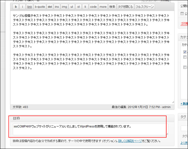 そうすると本文スペースの下に抜粋スペースができますので、こちらに概要文を書きます。