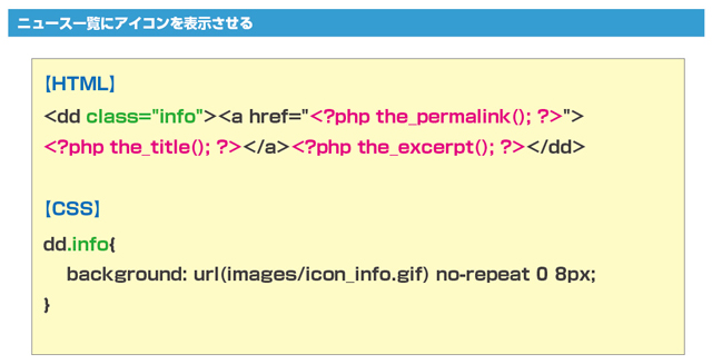 ・セミナーの場合は<dd class="seminar">となりCSSで別の背景画像を指定することによってカテゴリによってアイコンを振り分けることができます。