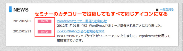 これで、お知らせの記事には「info」のアイコンがつき、セミナーの記事には「seminar」のアイコンがつきました。