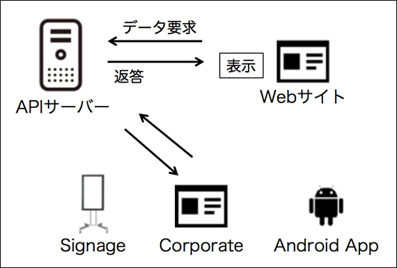 下記の図はAPIサーバーにコンテンツを集約し、Webサイトの他に、コーポレートサイト、デジタルサイネージ、アンドロイドアプリにもコンテンツを配信しているイメージ図です。
