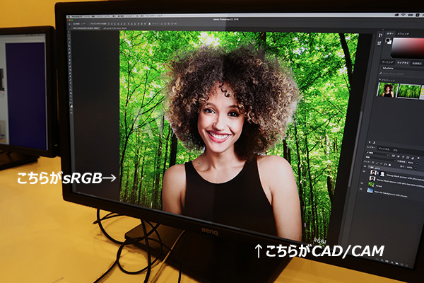 そのほか「BenQ PD2700Q」では、デスクトップを2分割し、それぞれに異なる表示モードを適用できる「デュアルビュー」機能も利用できる。当日の教室では、画面の左半分をsRGBモード、右半分をCAD/CAMモードで表示する体験を実施。CAD/CAMモードはコントラストが高くなり文字などがクッキリと読みやすい表示だ。講師の黒野氏からは、sRGBモードにした画面の左半分で画像を編集し、テキストエディタなどをCAD/CAMモードにした右半分で扱うオススメの使い方が紹介された。