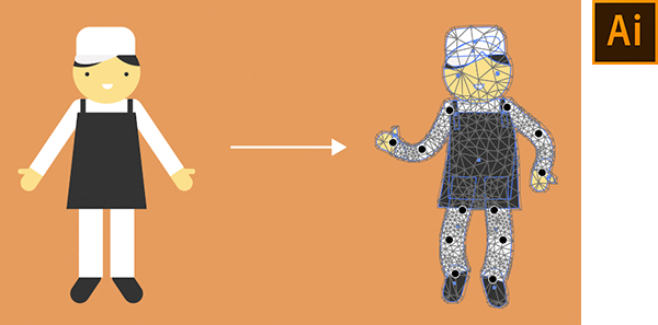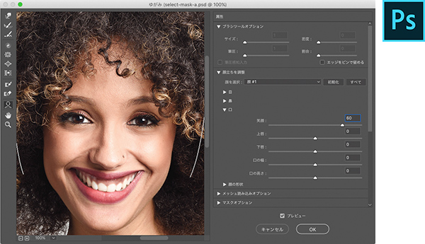 続いて、Adobe XDのデザイン上に配置するメイン画像やロゴの作成のために、PhotoshopやIllustratorの機能が厳選して紹介された。Photoshopでは、「クイック選択ツール」の「被写体を選択」コマンドや「選択とマスク...」機能を活用した人物画像の素早い切り抜きと、「ゆがみ...」フィルターによる表情の調整を解説。Illustratorでは、大まかな描画操作でも正確な幾何学図形を作成できる「Shaperツール」や、手軽に複数のシェイプの結合/消去が可能な「シェイプ形成ツール」、人物や動物などの関節の変形に特に便利な「パペットワープツール」などの使い方がレクチャーされた。