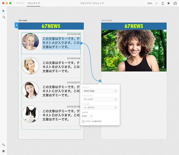 インタラクションの設定も簡単で、リンク元にしたいオブジェクトを選択すると、矢印が付いた「接続ハンドル」が表示。それをリンク先にしたいアートボードへドラッグ&ドロップで引っ張るだけで、リンクを設定することが可能だ。なお、「リピートグリッド」内の個別のオブジェクトをリンク元にしたい場合には、「リピートグリッド」をダブルクリックすることで中の各パーツを選択できる。オプションでトランジションやイージングの設定にも対応。ただし、それらの設定機能に関しては類似ソフトと比べて決して充実しているとは言えず、講師の黒野氏曰く「今後に期待」される機能のようだ。