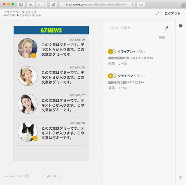 オンライン共有では「プロトタイプを公開」機能を使ってAdobeのサーバ上にデータを送り、Webブラウザでの閲覧用のURLを発行してもらうことが可能。任意でホットスポットのヒント表示やパスワード設定もでき、閲覧側からコメント機能も利用できる。このプロトタイプ作成機能やプレビュー機能は、一般の受講者からも「クライアントに確認してもらう工程など仕事に直結して使えそう」と好評であった。