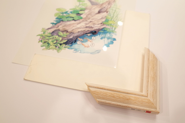描かれているモチーフから発想して、葉のレリーフが施された額縁も試してみる。より可愛らしい印象に