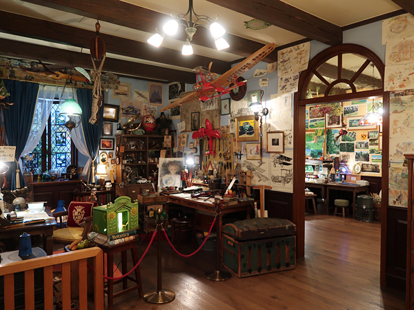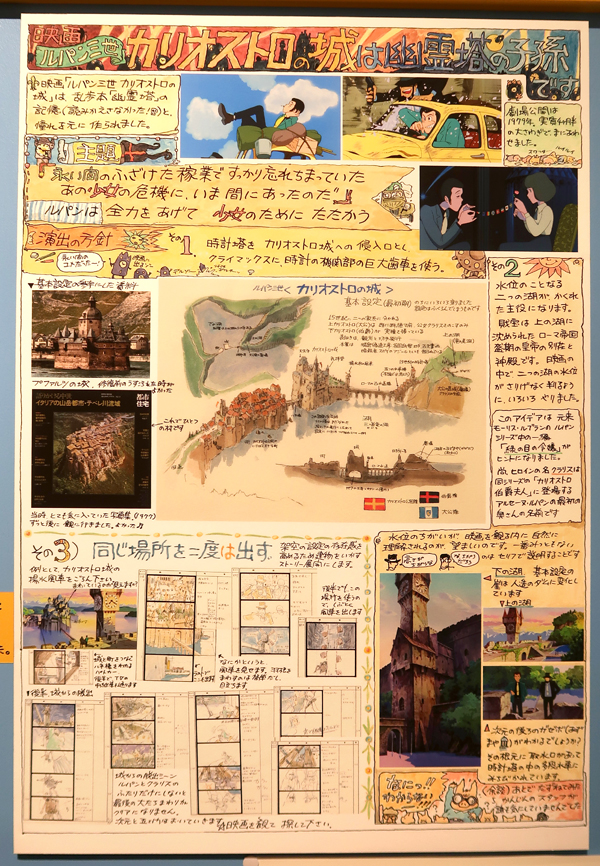 「幽霊塔へようこそ展(2015年5月30日~2016年5月8日)」では、宮崎駿監督が強い影響を受けたという江戸川乱歩作「幽霊塔」の世界を自ら描いたパネルで紹介。この怪奇大ロマンは宮崎監督が中学生の頃に出会って夢中になって読み、「ルパン三世カリオストロ」は「幽霊塔」の記憶と憧れをもとに作られたのだという。映画に登場するカリオストロ城や時計塔、隠れた主役となる二つの湖などの細かい設定、演出の方針についても、解りやすい漫画の形で語られている。