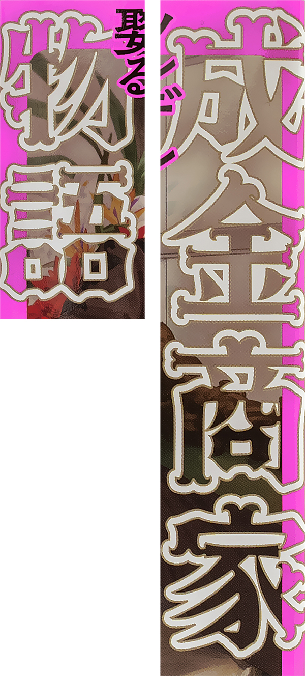 当初は作品の舞台を意識して海外翻訳文学を想起させる異国感のある書体が検討されたが、馴染み過ぎて面白みに欠けてしまうと判断。そこで装画が持つインパクトや、タイトルの「成金」、「商家」などの言葉が持つ語感を生かすことを重視し、あえてビジュアルに馴染まない装飾過剰でいささかキッチュな印象を持つ書体が選ばれた。おじさんが主人公なのに少女漫画のタイトルに見える違和感を演出するのも狙い。
