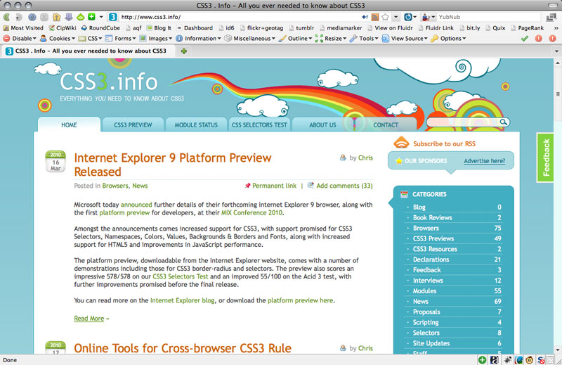 ▲「CSS3.info」では、CSS 3の情報を扱うサイトでもブラウザの実装状況を含めた最新情報が更新されている