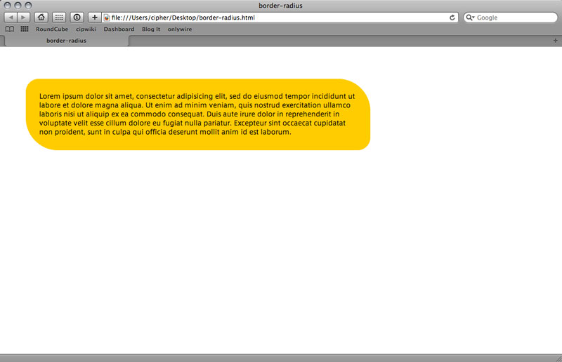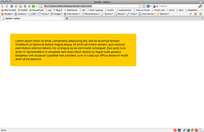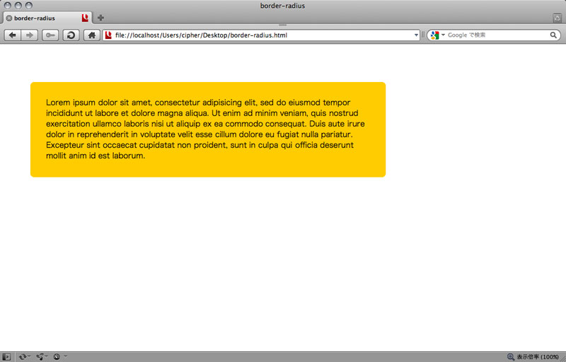 ▲border-radiusプロパティを使った角丸表現は、現在Operaだけではプロパティ名をそのまま記述しても適用される。そのほかのブラウザに対応させるには「-moz-border-radius」、「-webkit-border-radius」を使用する。Internet Explorerは、最新版でも未対応なので角丸にならず通常通り矩形のボックスが表示される