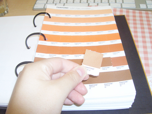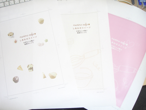 今日は「スイーツ本」の表紙(カバーの下)のデザイン修正作業からスタートします。以前にカンプを提出していて大体の方向性は決まっているので、タイトル部分の修正と、色の最終決定などを行っていきます。特色のチップを見ながら、どれがいいかを選定。意外と優柔不断な私、なかなか「これ!」と決定できません。あれもこれもいいんだよなぁ……。