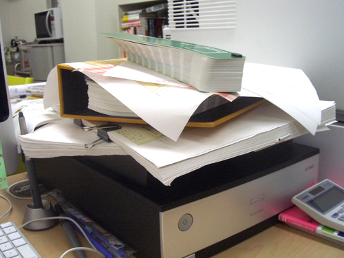 修正が終わったので全ページの出力をすることに。かなりデータが重いので出力に時間かかるなぁ……と思っていたら、ちょうど昨日頼んでおいた備品が到着しました。出力してる間に備品の整理を行います。さらに、机周辺の片付けも。自分のデスクの横にあるスキャナの上にポンポン物を置くクセがあるので、気づいたらスゴいことになってました。ゴメンナサイ。
