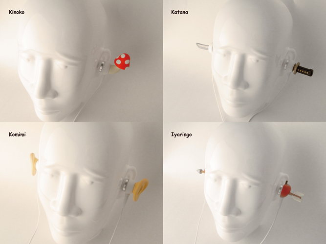イヤホンからキノコが生えているデザインを採用した「キノコ」、リンゴに弓矢が刺さっている「イヤリンゴ」、耳に日本刀が刺さったようにみえる「カタナ」、耳のかたちのデコレーションを装備した「コミミ」の4種類を用意。
