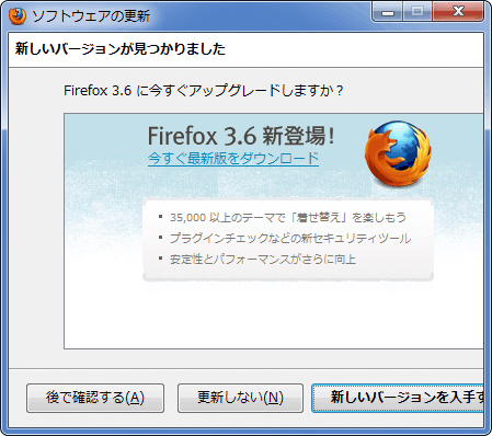 Mozilla、Firefox3.6への移行をすすめる更新通知画面を表示