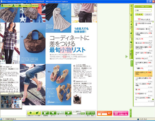 キーワード検索では、デジタルカタログ内のすべての文字情報を対象としたキーワード検索が可能。従来はキーワードが含まれるページ全体を表示するのみであったが、新たにキーワードに該当する部分を網掛けで表示するとともに、実物カタログサイズに拡大して画面中央に表示できるようになった。